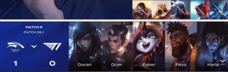 T1选用:Doran奎桑提、Oner赵信、Faker塞拉斯、Peyz厄斐琉斯、Keria璐璐