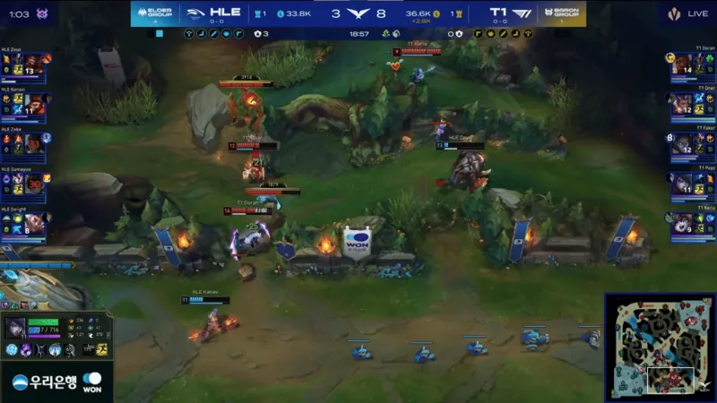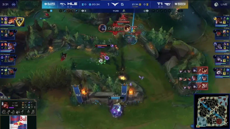 比赛第3分钟,HLE野辅强追残血Oner赵信被反杀,Faker塞拉斯开场3分钟拿到双杀→
